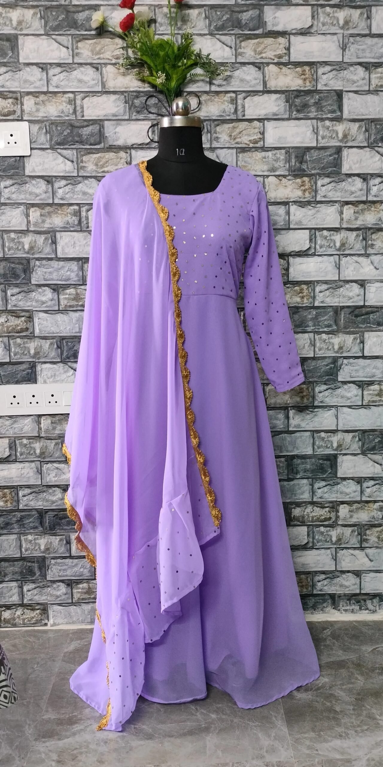 Add a touch of elegance to your wardrobe with this exquisitely designed lavender georgette gown. Crafted for sophistication and grace, this gown features a flowing georgette fabric that drapes beautifully, offering a dreamy and ethereal silhouette. The soft lavender hue enhances its delicate charm, making it a perfect choice for weddings, evening parties, and special occasions.
